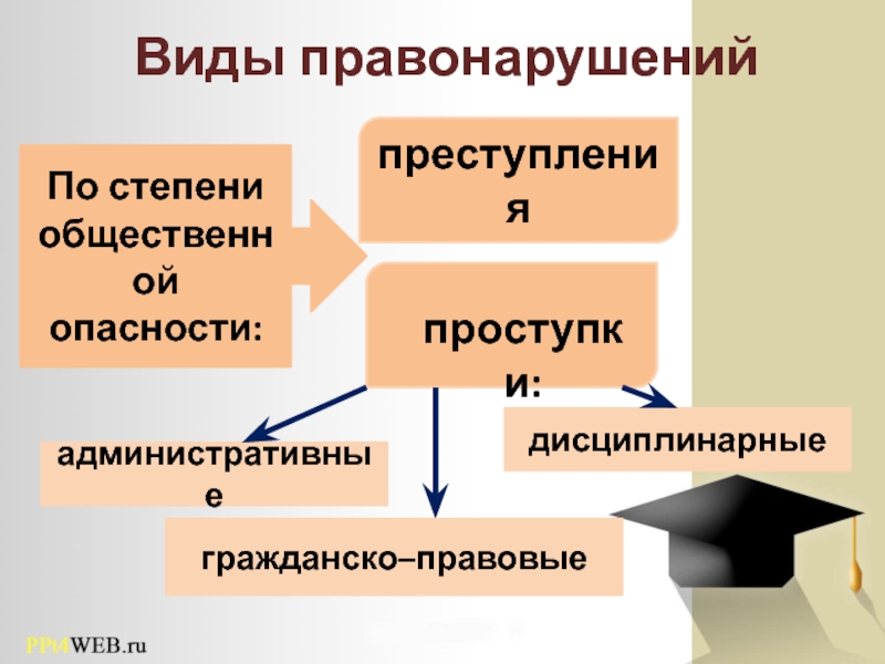Виды правонарушений   По степени общественной опасности:проступки:преступленияадминистративныедисциплинарныегражданско–правовые