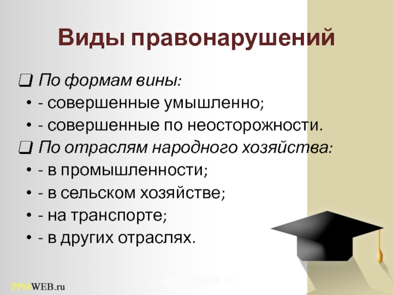 Виды правонарушений По формам вины:- совершенные умышленно;- совершенные по неосторожности.По отраслям народного хозяйства:- в промышленности;- в сельском