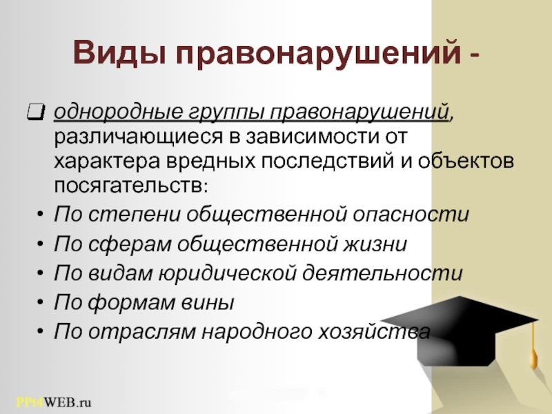 Виды правонарушений -однородные группы правонарушений, различающиеся в зависимости от характера вредных последствий и объектов посягательств:По степени общественной