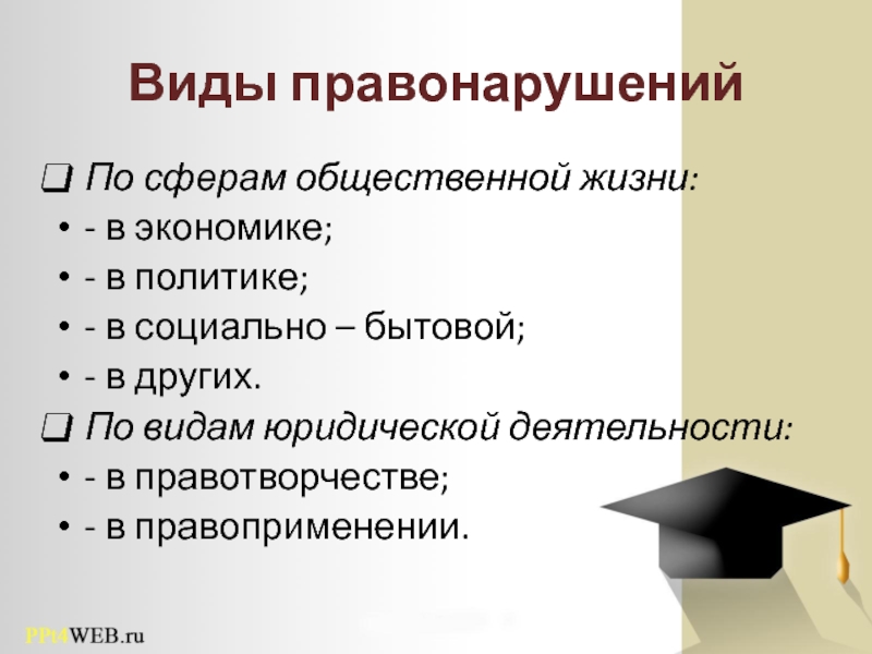 Виды правонарушений По сферам общественной жизни:- в экономике;- в политике;- в социально – бытовой;- в других.По видам