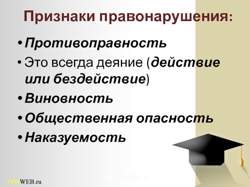 Признаки правонарушения:Противоправность Это всегда деяние (действие или бездействие)Виновность Общественная опасность Наказуемость