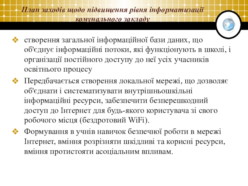 Слайд 3План заходів щодо підвищення рівня інформатизації комунального закладу
