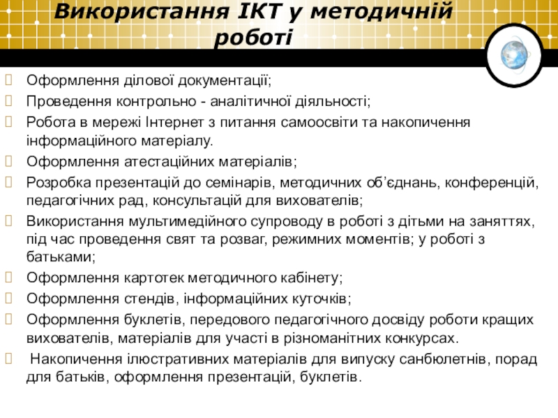 Розробка презентацій до семінарів, методичних об’єднань, конференцій, педагогічних рад, консультацій для вихователів;