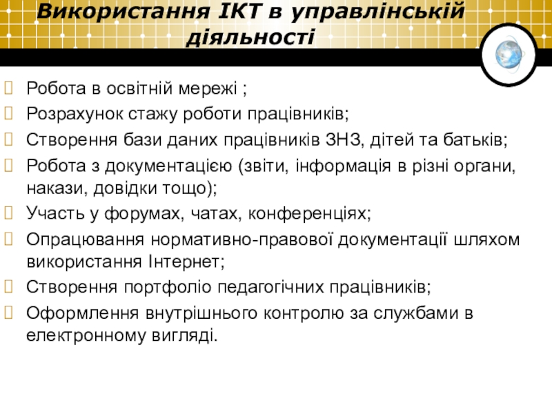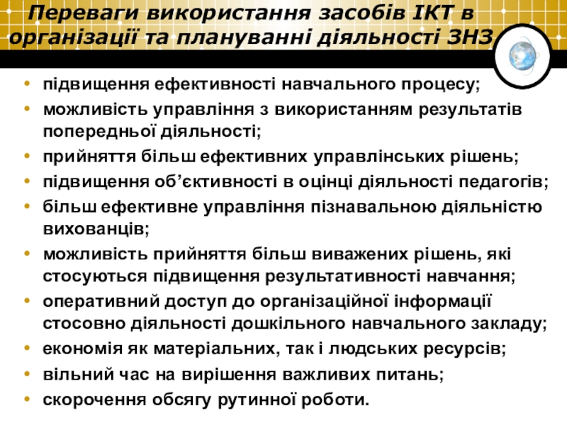 Слайд 12Переваги використання засобів ІКТ в організації та плануванні діяльності ЗНЗ