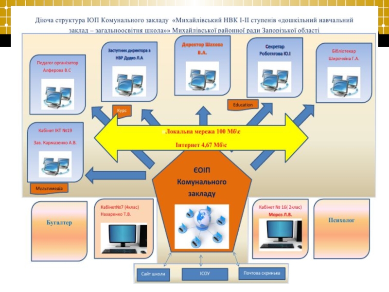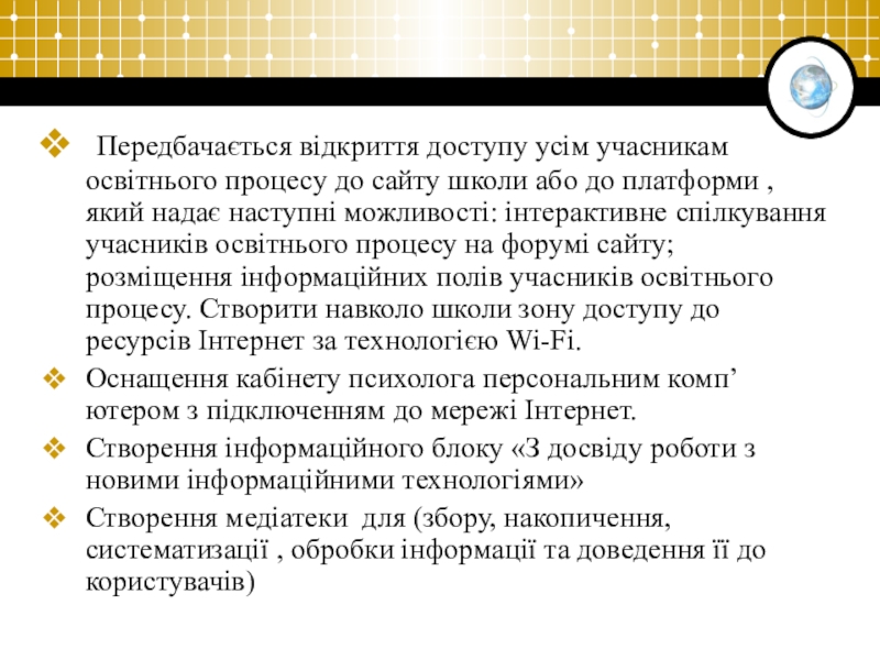 Передбачається створення локальної мережі, що дозволяє об'єднати і систематизувати внутрішньошкільні інформаційні ресурси, забезпечити безперешкодний доступ до Інтернет для будь-якого користувача зі свого робочого місця (бездротовий WiFi).