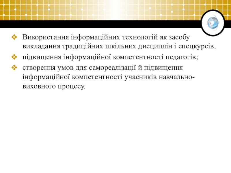 Слайд 5Використання інформаційних технологій як засобу викладання традиційних шкільних дисциплін і спецкурсів.