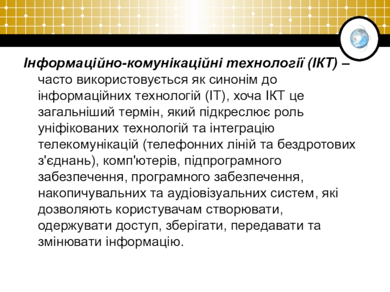 Слайд 6Інформаційно-комунікаційні технології (ІКТ) – часто використовується як синонім до інформаційних технологій