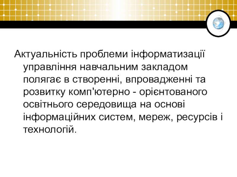 Актуальність проблеми інформатизації управління навчальним закладом полягає в створенні, впровадженні та