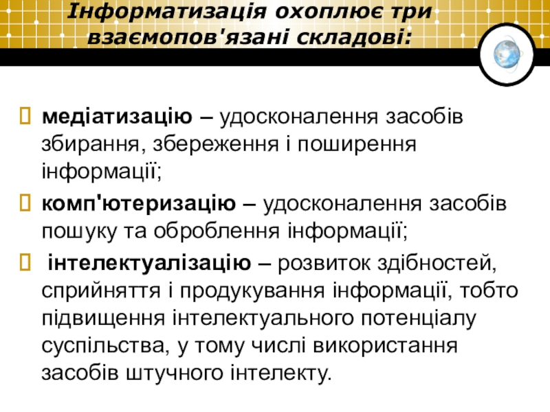 Слайд 11Інформатизація охоплює три взаємопов'язані складові: