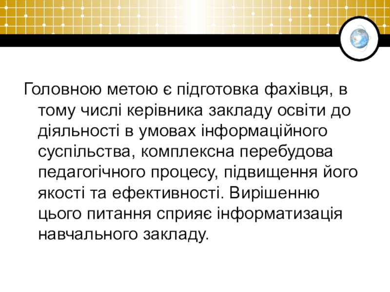 Головною метою є підготовка фахівця, в тому числі керівника закладу освіти