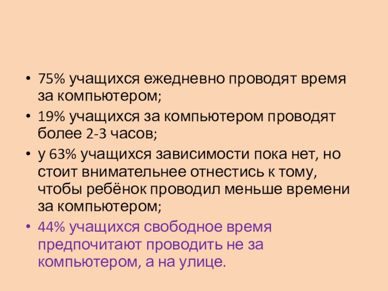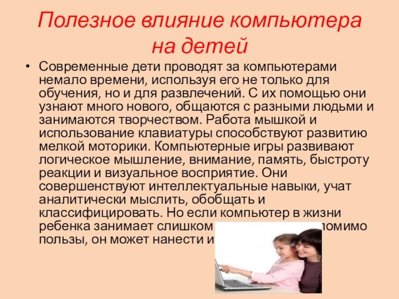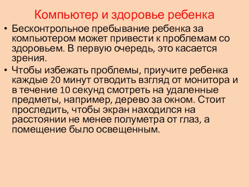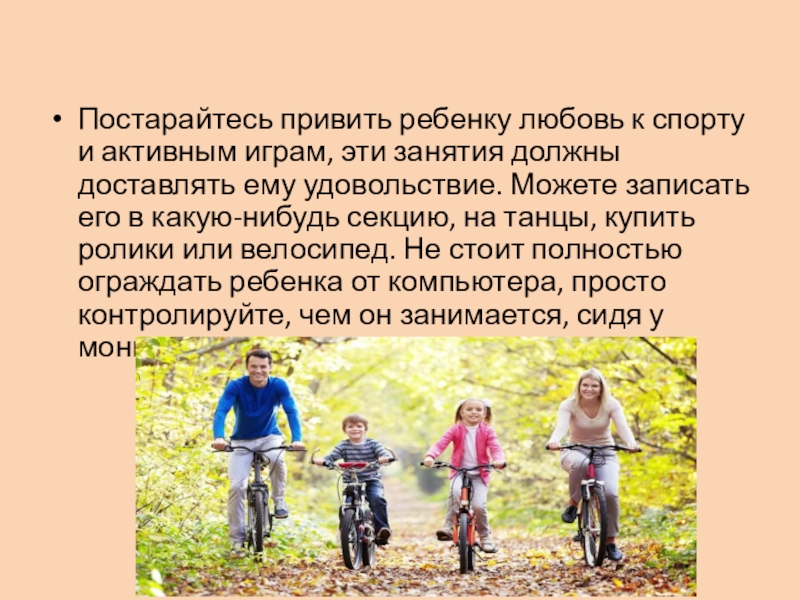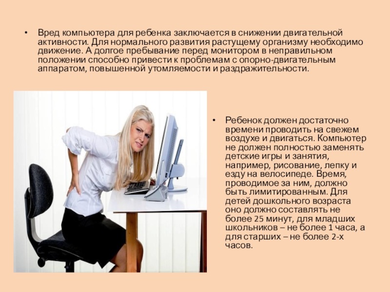 Ребенок должен достаточно времени проводить на свежем воздухе и двигаться. Компьютер не должен полностью заменять детские игры и занятия, например, рисование, лепку и езду на велосипеде. Время, проводимое за ним, должно быть лимитированным. Для детей дошкольного возраста оно должно составлять не более 25 минут, для младших школьников – не более 1 часа, а для старших – не более 2-х часов.