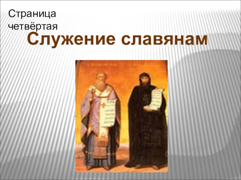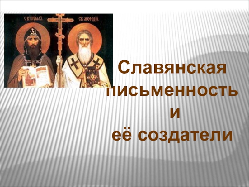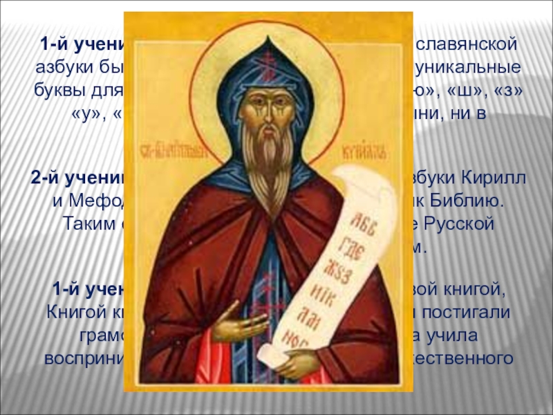 2-й ученик. После создания славянской азбуки Кирилл и Мефодий перевели на славянский язык Библию. Таким образом, письменность на земле Русской началась Священным Писанием.