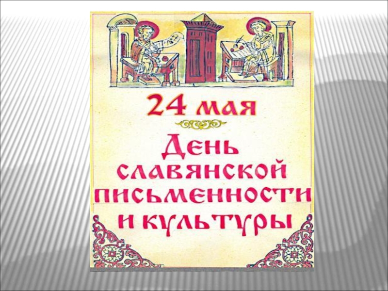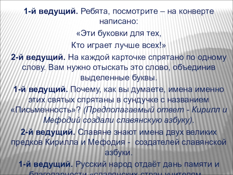 1-й ведущий. Почему, как вы думаете, имена именно этих святых спрятаны в сундучке с названием «Письменность»? (Предполагаемый ответ - Кирилл и Мефодий создали славянскую азбуку).