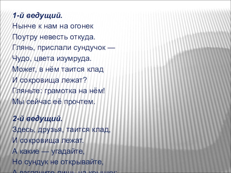 Слайд 21-й ведущий. Здравствуйте, ребята! Здравствуйте, люди добрые! Мы рады вас приветствовать