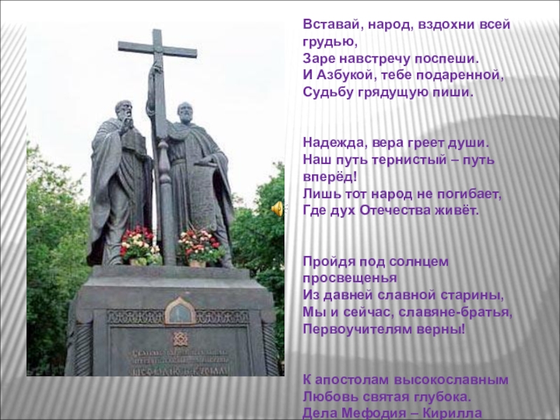 1-й ведущий. Русский народ отдаёт дань памяти и благодарности «славянских стран учителям... Божественных писаний, источник богопознания нам источивших».