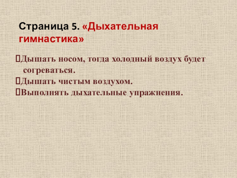 Страница 5. «Дыхательная гимнастика»Дышать носом, тогда холодный воздух будет согреваться.Дышать чистым воздухом.Выполнять дыхательные упражнения.