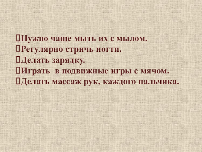 Нужно чаще мыть их с мылом.Регулярно стричь ногти.Делать зарядку.Играть в подвижные игры с мячом.Делать массаж рук, каждого