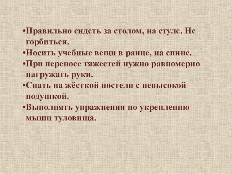 Правильно сидеть за столом, на стуле. Не горбиться.Носить учебные вещи в ранце, на спине.При переносе тяжестей нужно