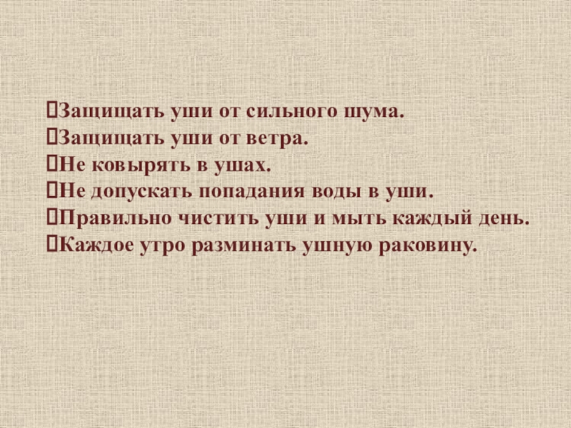 Защищать уши от сильного шума.Защищать уши от ветра.Не ковырять в ушах.Не допускать попадания воды в уши.Правильно чистить