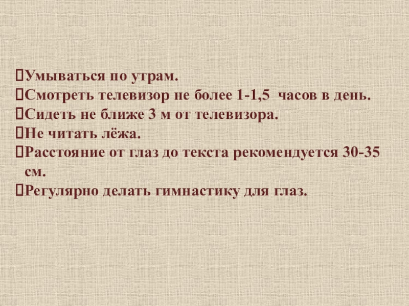 Умываться по утрам.Смотреть телевизор не более 1-1,5 часов в день.Сидеть не ближе 3 м от телевизора.Не читать