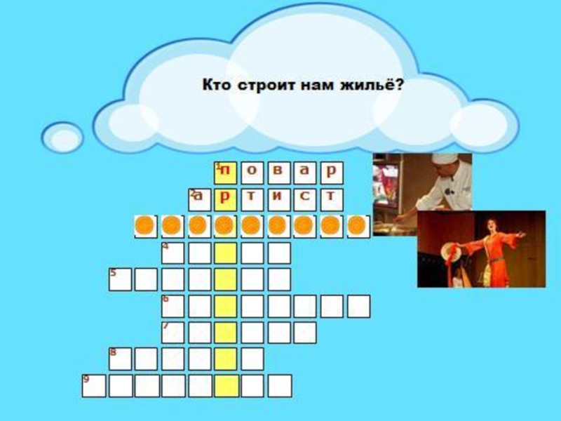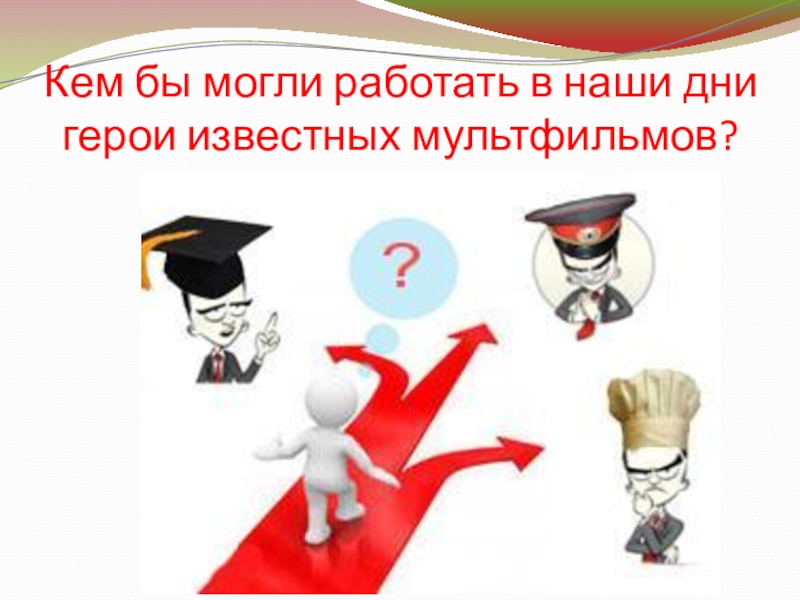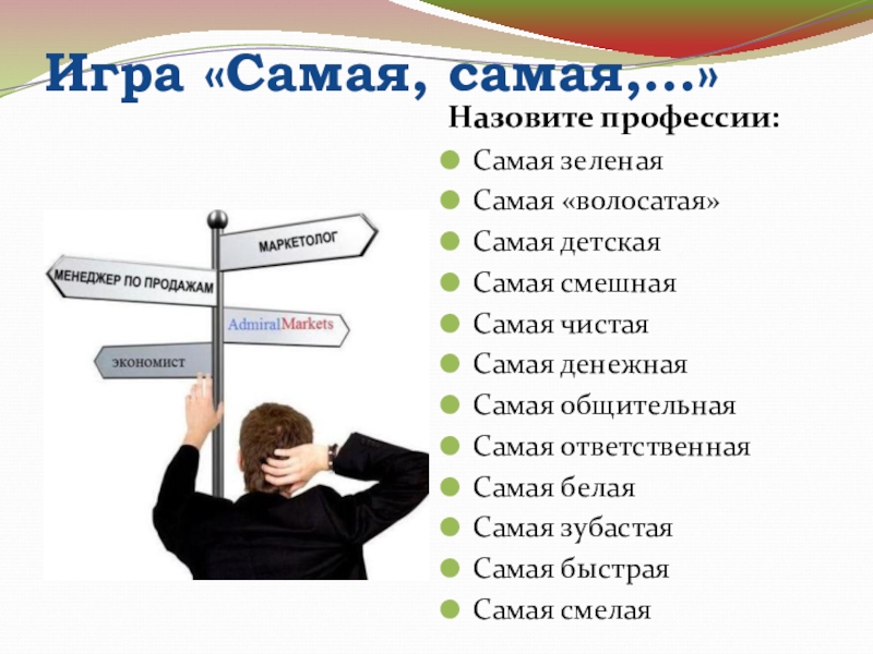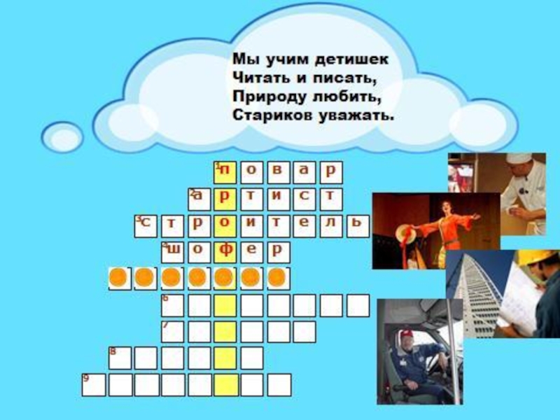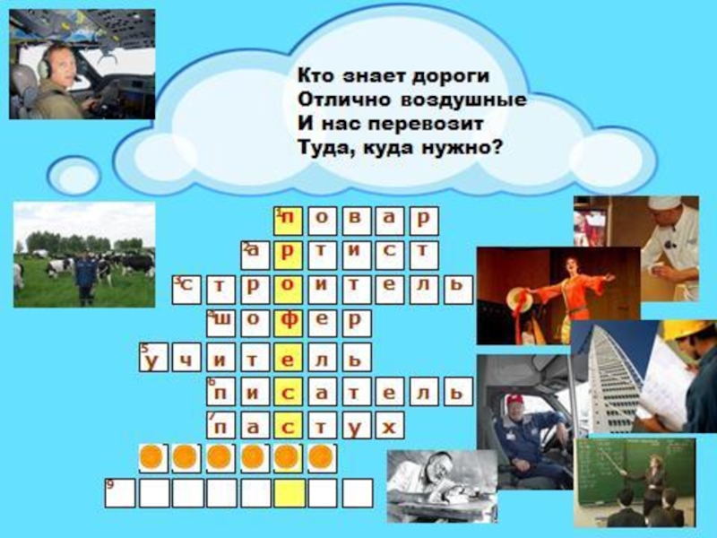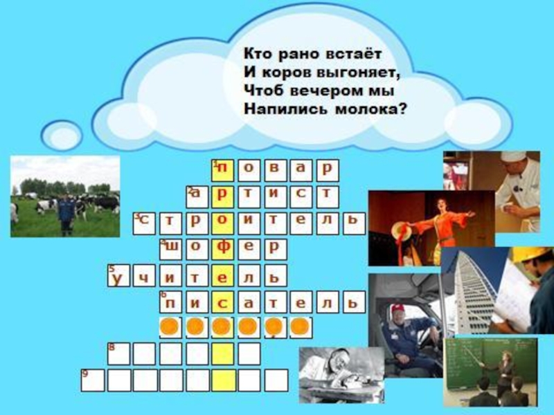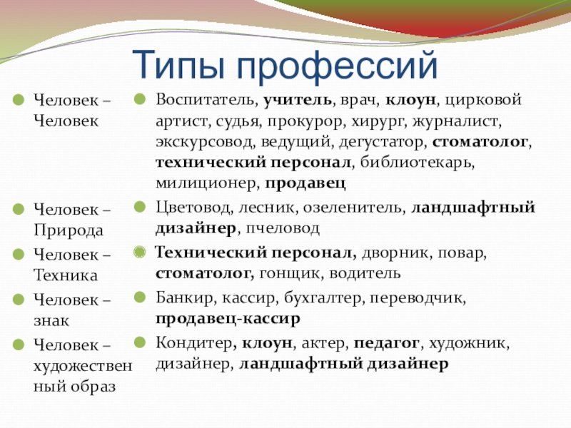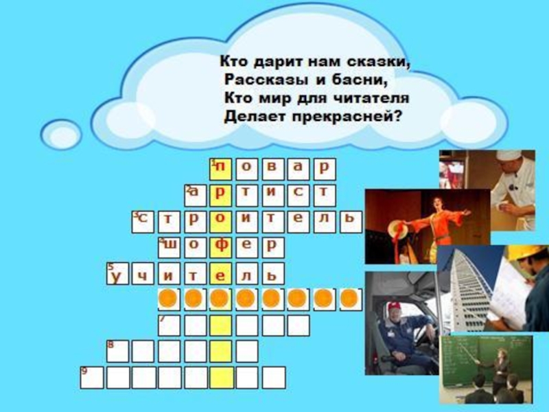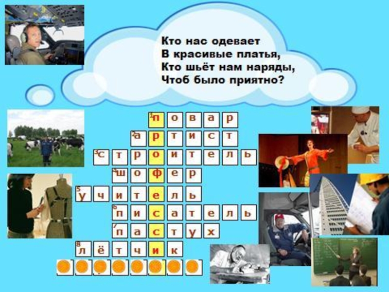 Воспитатель, учитель, врач, клоун, цирковой артист, судья, прокурор, хирург, журналист, экскурсовод, ведущий, дегустатор, стоматолог, технический персонал, библиотекарь, милиционер, продавец