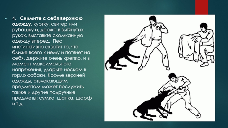 в вытянутых руках, выставьте скомканную одежду вперед. Пес инстинктивно схватит то, что ближе всего к нему и потянет на себя. Держите очень крепко, и в момент максимального напряжения, ударьте носком в горло собаки. Кроме верхней одежды, отвлекающим предметом может послужить также и другие подручные предметы: сумка, шапка, шарф и т.д.