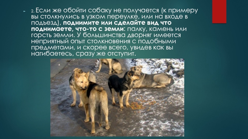 в узком переулке, или на входе в подъезд), поднимите или сделайте вид что поднимаете, что-то с земли: палку, камень или горсть земли. У большинства дворняг имеется неприятный опыт столкновения с подобными предметами, и скорее всего, увидев как вы нагибаетесь, сразу же отступит.