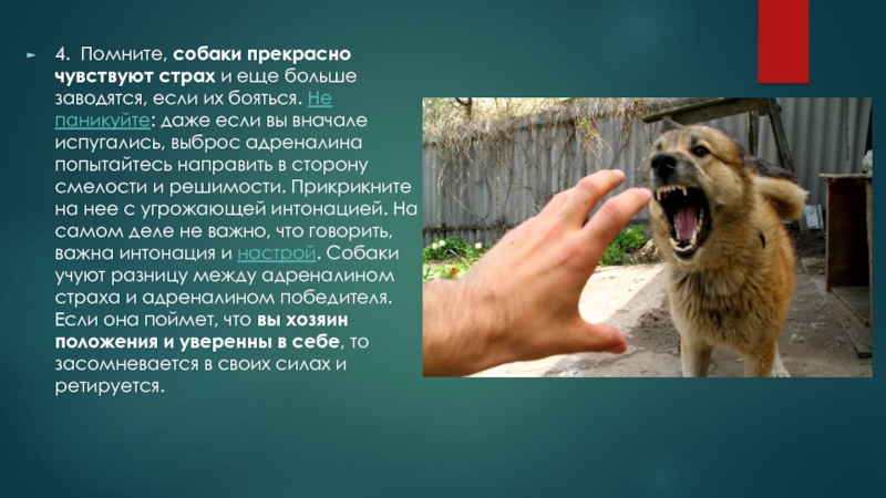 Слайд 64. Помните, собаки прекрасно чувствуют страх и еще больше заводятся, если их бояться. Не