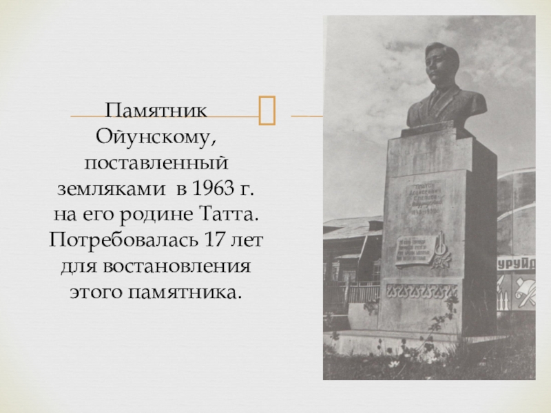 Слайд 25Памятник Ойунскому, поставленный земляками в 1963 г. на его родине Татта.