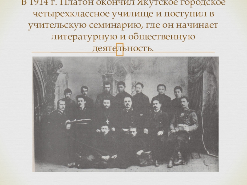 Слайд 15В 1914 г. Платон окончил Якутское городское четырехклассное училище и поступил