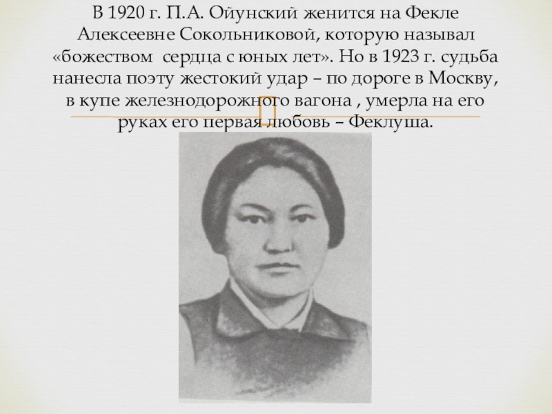 Слайд 17В 1920 г. П.А. Ойунский женится на Фекле Алексеевне Сокольниковой, которую