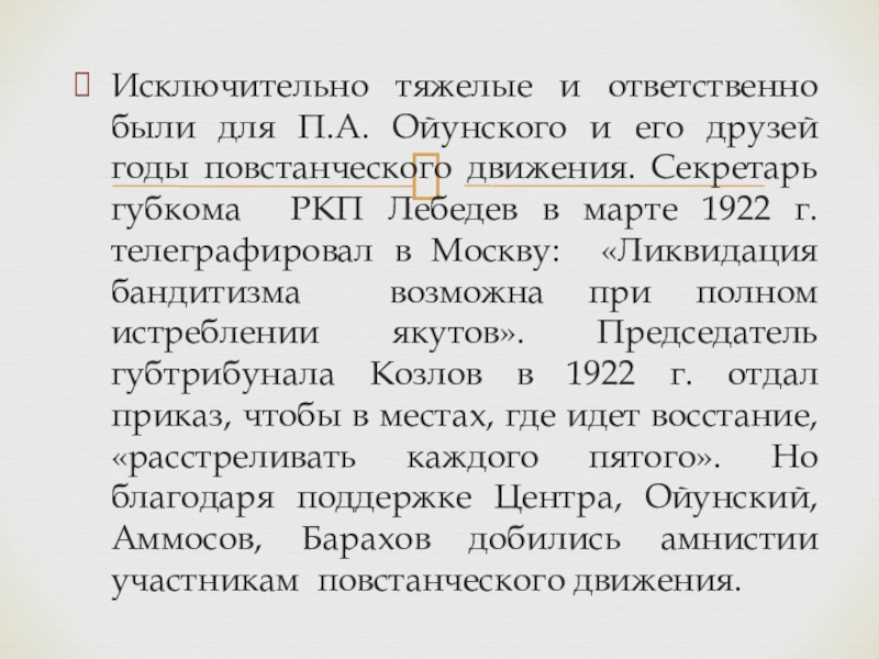 годы повстанческого движения. Секретарь губкома РКП Лебедев в марте 1922 г. телеграфировал в Москву: «Ликвидация бандитизма возможна при полном истреблении якутов». Председатель губтрибунала Козлов в 1922 г. отдал приказ, чтобы в местах, где идет восстание, «расстреливать каждого пятого». Но благодаря поддержке Центра, Ойунский, Аммосов, Барахов добились амнистии участникам повстанческого движения.