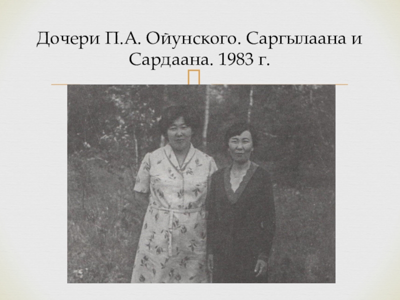 Слайд 26Дочери П.А. Ойунского. Саргылаана и Сардаана. 1983 г.