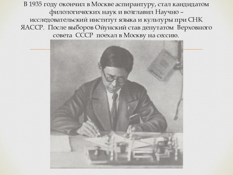 и возглавил Научно – исследовательский институт языка и культуры при СНК ЯАССР. После выборов Ойунский став депутатом Верховного совета СССР поехал в Москву на сессию.