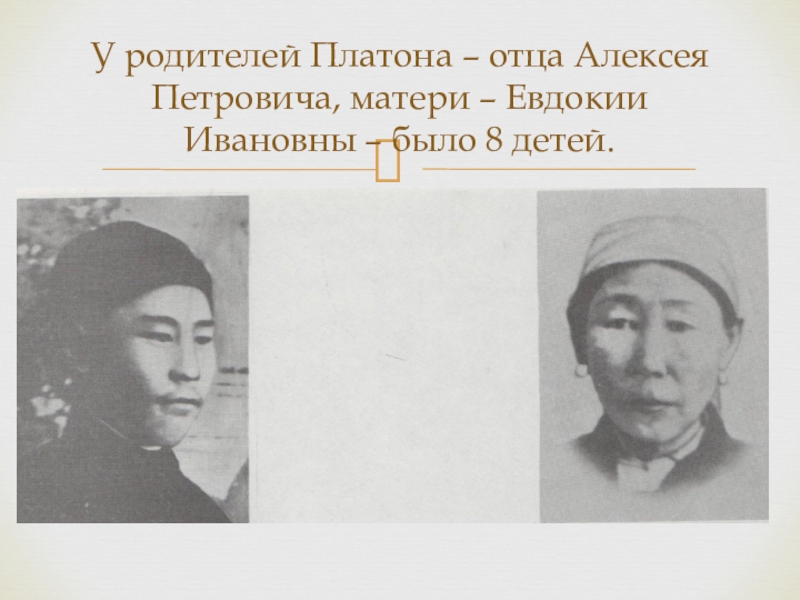 Слайд 13У родителей Платона – отца Алексея Петровича, матери – Евдокии Ивановны