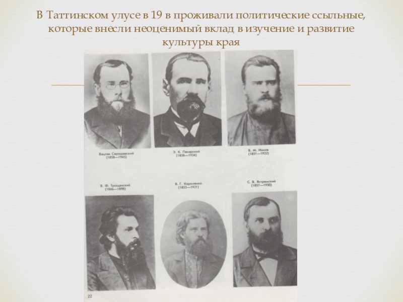 Слайд 8В Таттинском улусе в 19 в проживали политические ссыльные, которые внесли
