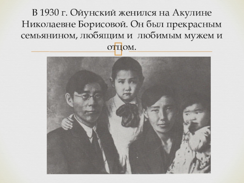 Слайд 21В 1930 г. Ойунский женился на Акулине Николаевне Борисовой. Он был
