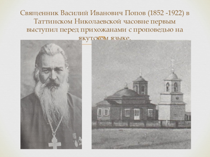 Слайд 7Священник Василий Иванович Попов (1852 -1922) в Таттинском Николаевской часовне первым