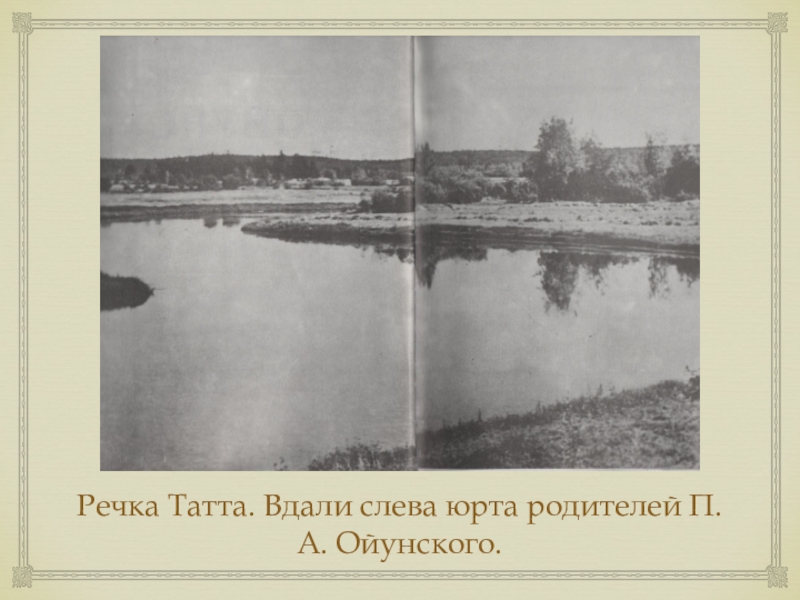 Слайд 3Речка Татта. Вдали слева юрта родителей П.А. Ойунского.