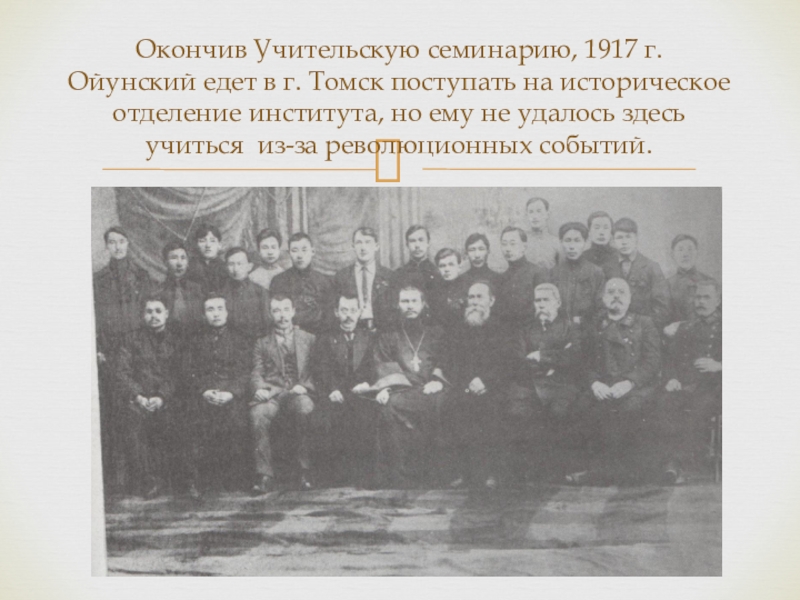 Слайд 16Окончив Учительскую семинарию, 1917 г. Ойунский едет в г. Томск поступать