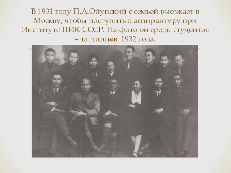 Слайд 22В 1931 году П.А.Ойунский с семьей выезжает в Москву, чтобы поступить