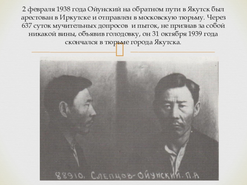 Слайд 242 февраля 1938 года Ойунский на обратном пути в Якутск был