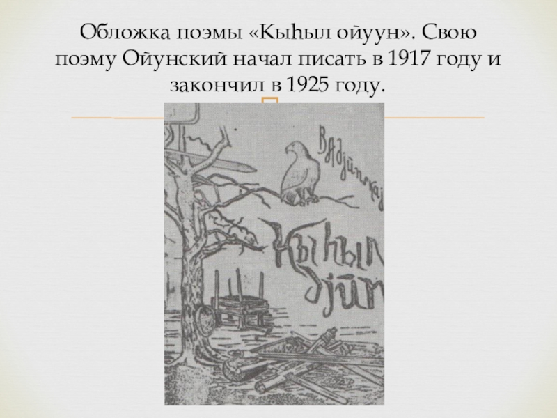 Слайд 20Обложка поэмы «Кыhыл ойуун». Свою поэму Ойунский начал писать в 1917