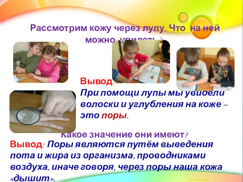 Вывод: Поры являются путём выведения пота и жира из организма, проводниками воздуха, иначе говоря, через поры наша кожа «дышит».