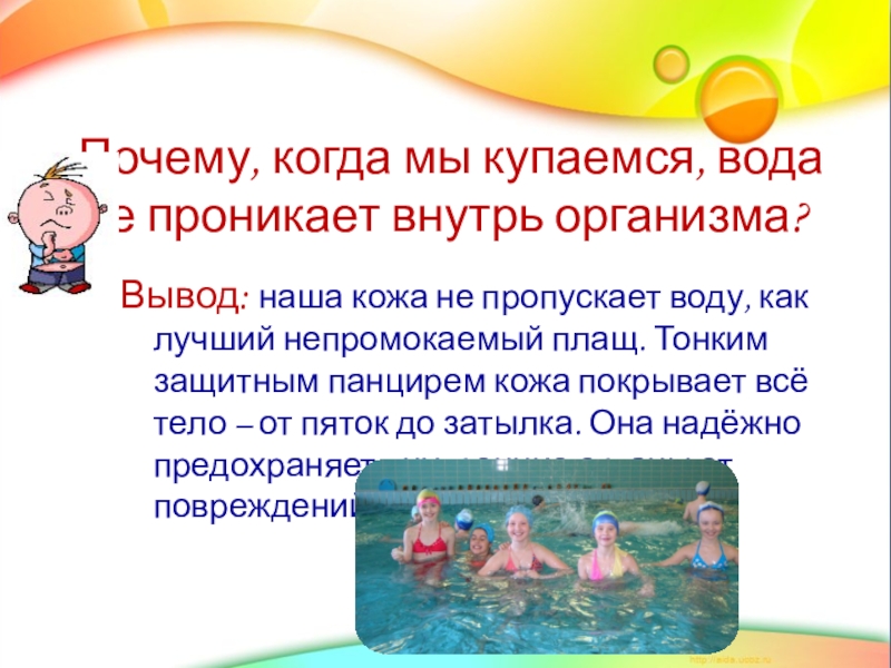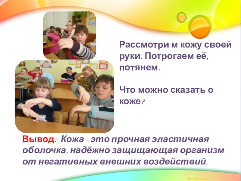 Вывод: Кожа - это прочная эластичная оболочка, надёжно защищающая организм от негативных внешних воздействий.