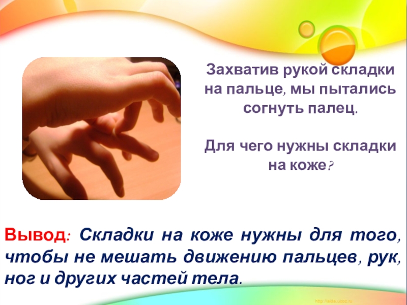 Вывод: Складки на коже нужны для того, чтобы не мешать движению пальцев, рук, ног и других частей тела.