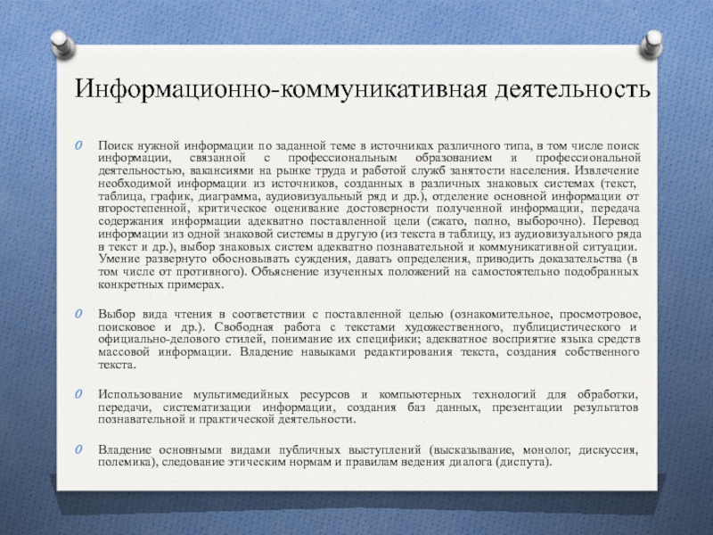 в том числе поиск информации, связанной с профессиональным образованием и профессиональной деятельностью, вакансиями на рынке труда и работой служб занятости населения. Извлечение необходимой информации из источников, созданных в различных знаковых системах (текст, таблица, график, диаграмма, аудиовизуальный ряд и др.), отделение основной информации от второстепенной, критическое оценивание достоверности полученной информации, передача содержания информации адекватно поставленной цели (сжато, полно, выборочно). Перевод информации из одной знаковой системы в другую (из текста в таблицу, из аудиовизуального ряда в текст и др.), выбор знаковых систем адекватно познавательной и коммуникативной ситуации. Умение развернуто обосновывать суждения, давать определения, приводить доказательства (в том числе от противного). Объяснение изученных положений на самостоятельно подобранных конкретных примерах.