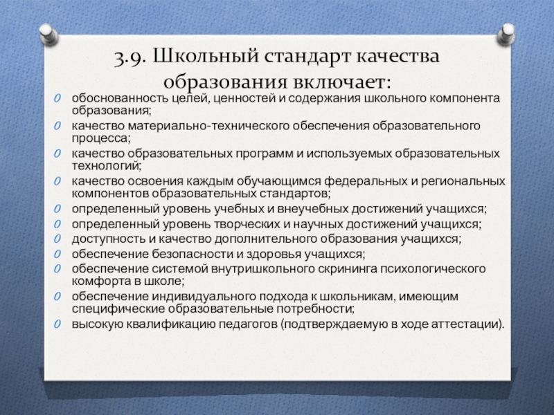 Слайд 193.9. Школьный стандарт качества образования включает: