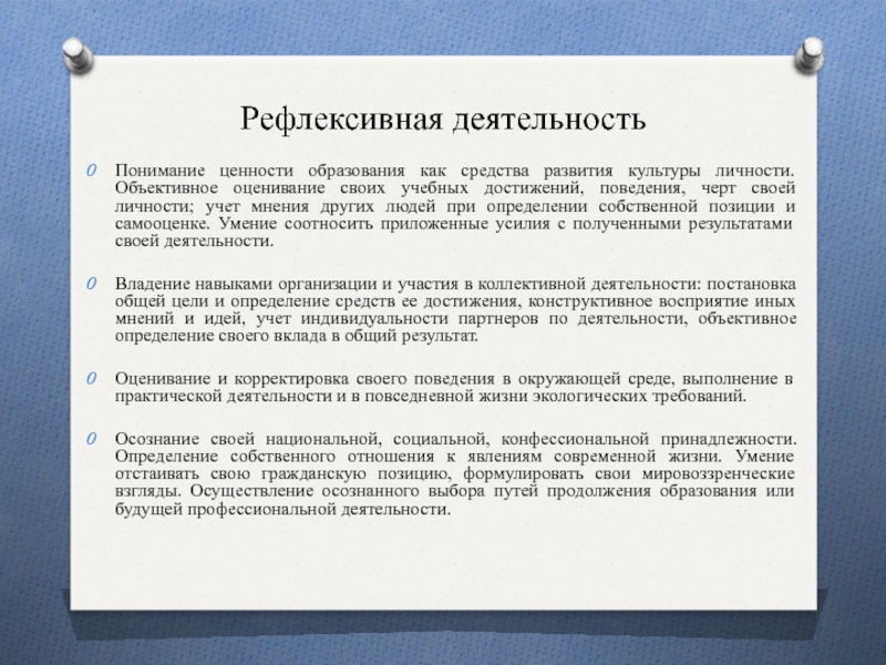 Осознание своей национальной, социальной, конфессиональной принадлежности. Определение собственного отношения к явлениям современной жизни. Умение отстаивать свою гражданскую позицию, формулировать свои мировоззренческие взгляды. Осуществление осознанного выбора путей продолжения образования или будущей профессиональной деятельности.