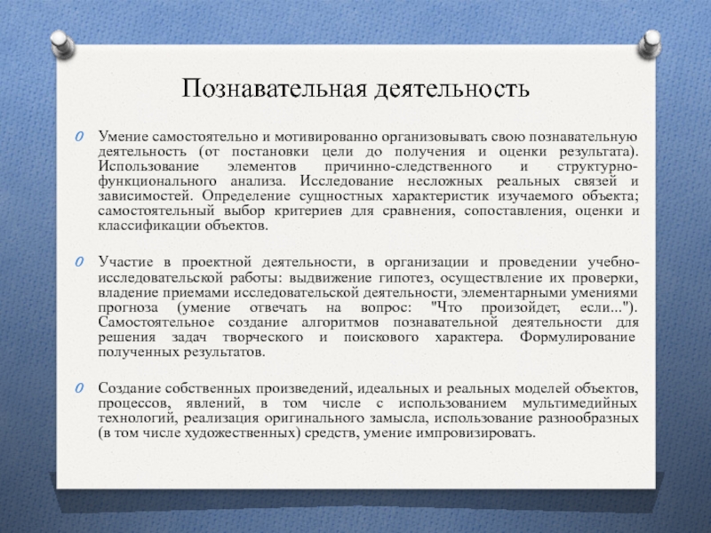 Участие в проектной деятельности, в организации и проведении учебно-исследовательской работы: выдвижение гипотез, осуществление их проверки, владение приемами исследовательской деятельности, элементарными умениями прогноза (умение отвечать на вопрос: "Что произойдет, если..."). Самостоятельное создание алгоритмов познавательной деятельности для решения задач творческого и поискового характера. Формулирование полученных результатов.